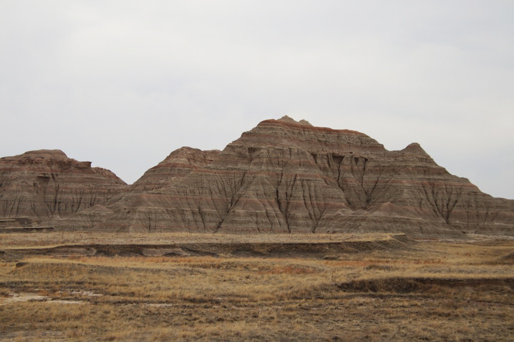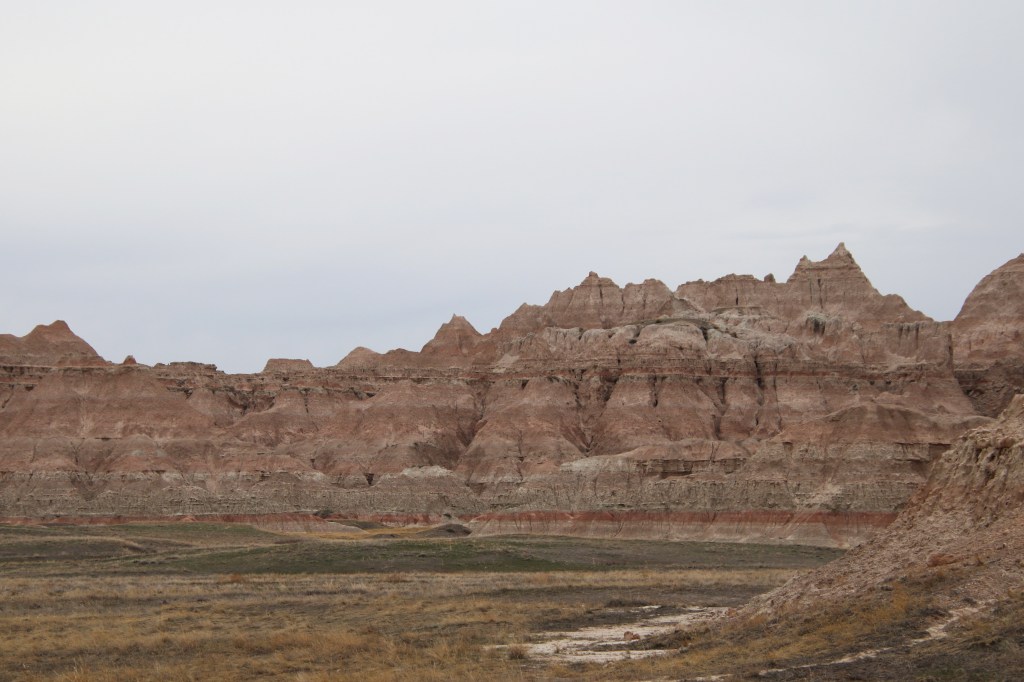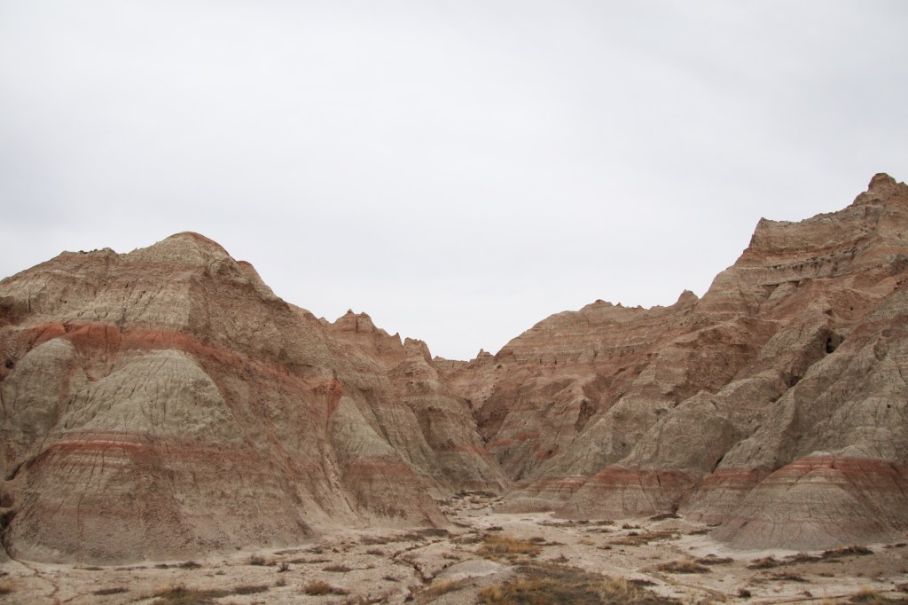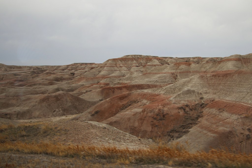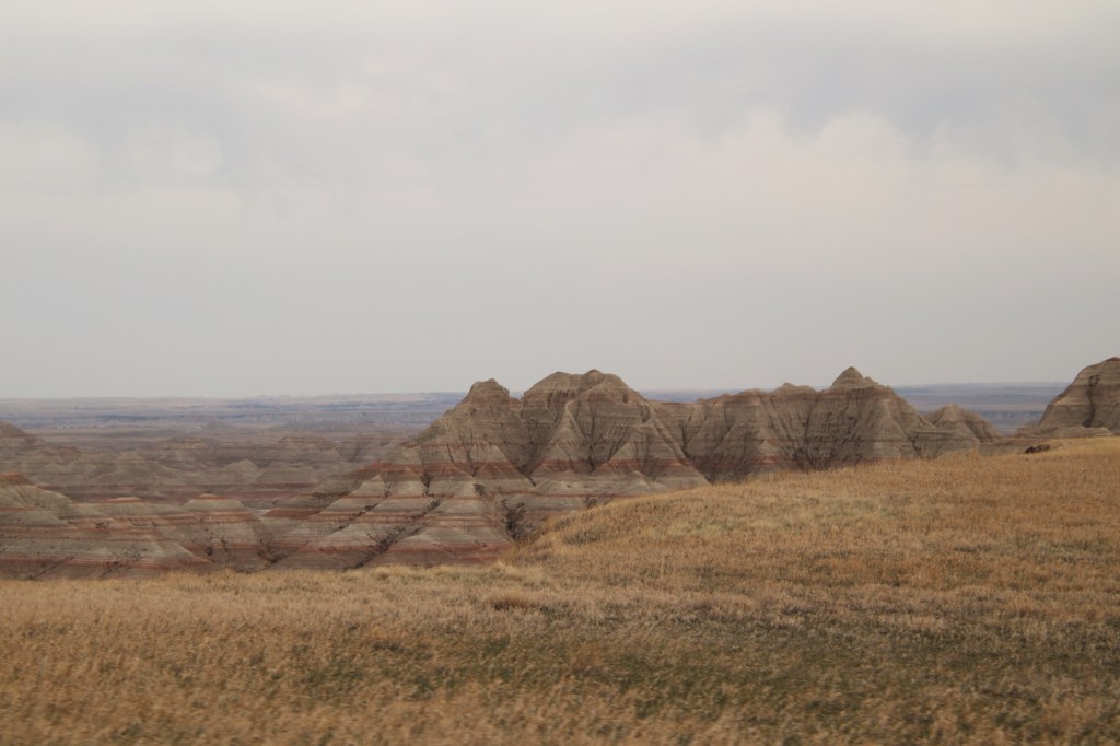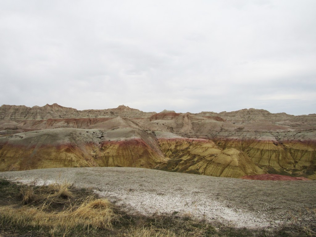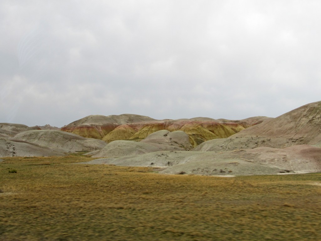 There were far too many photos taken of the amazing Badlands National Park formations, so I had to spend a little time whittling down (and straightening out the ones I shot crookedly – occupational hazard in the back seat on a bumpy road). Such a variety of color, texture, lines and shapes we saw. Fortunately, we didn’t encounter rain or snow in our short tenure there (but there was wind!)