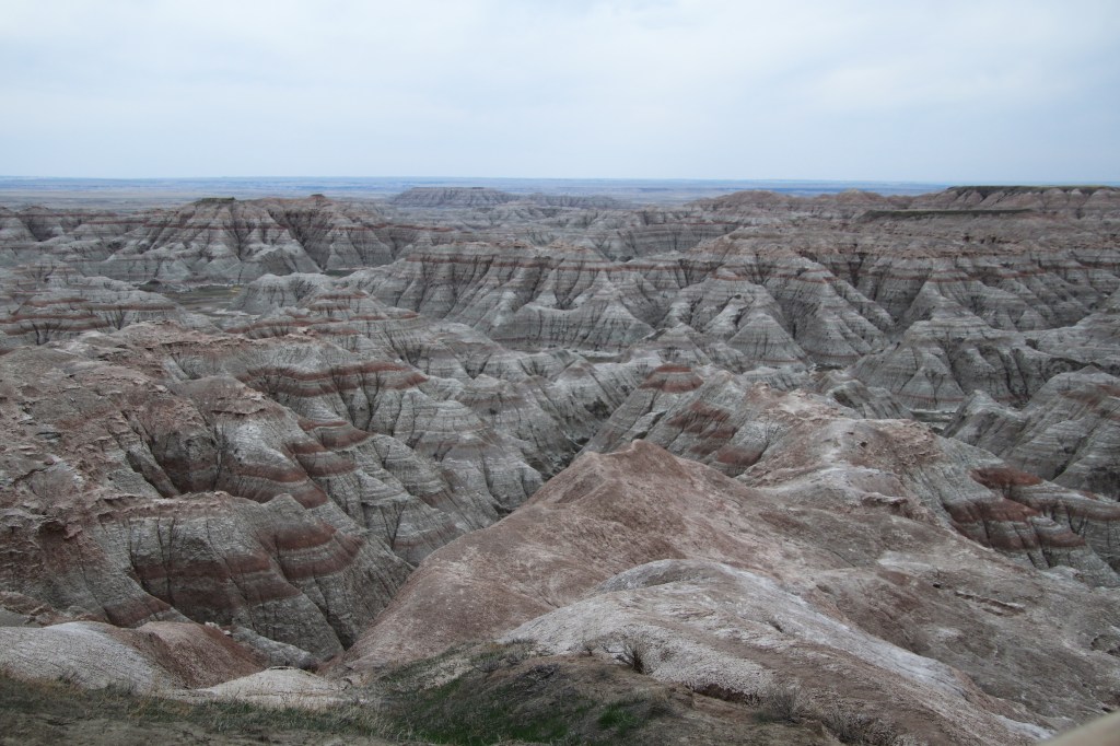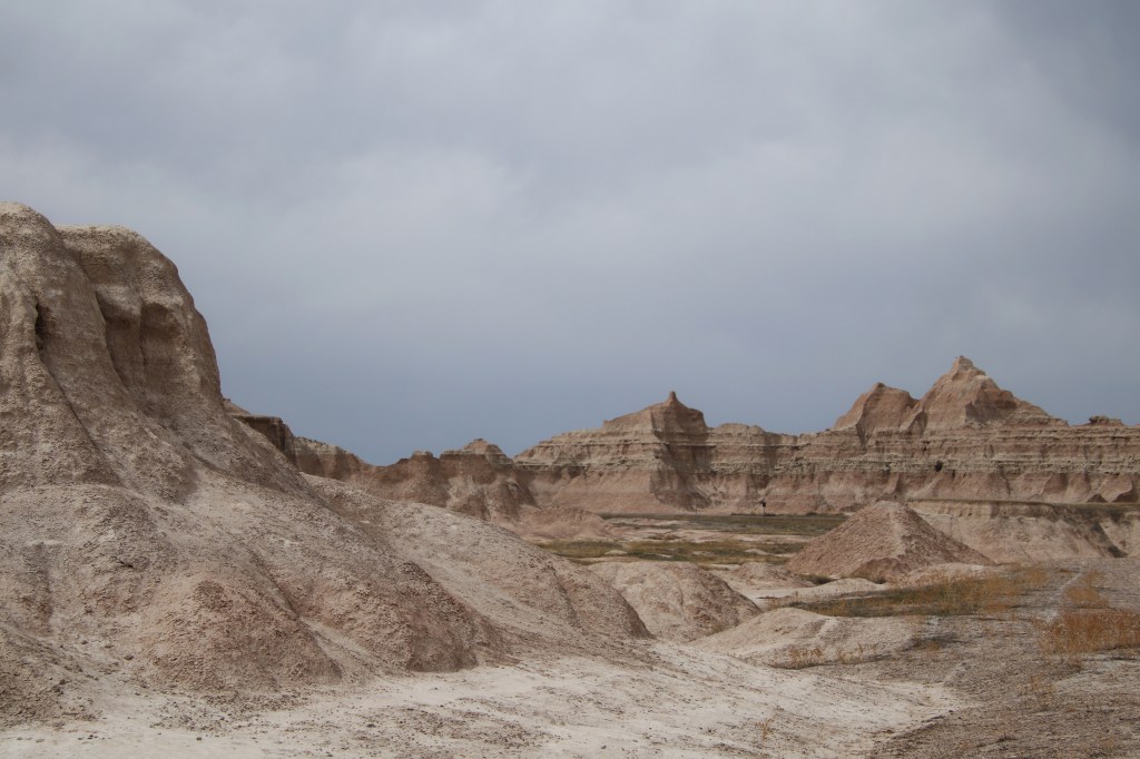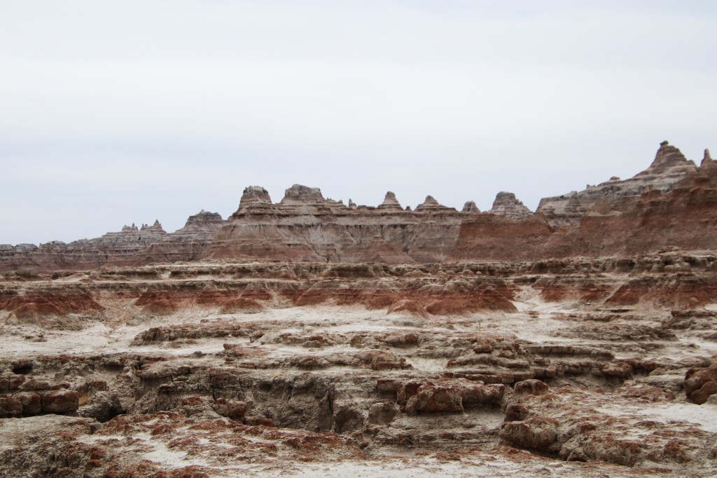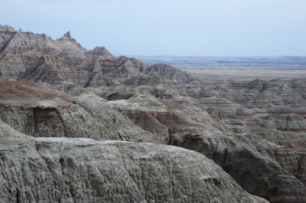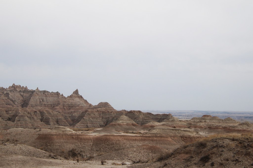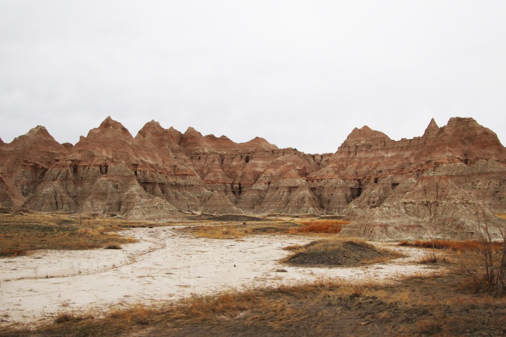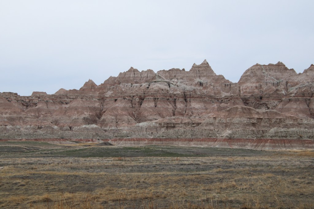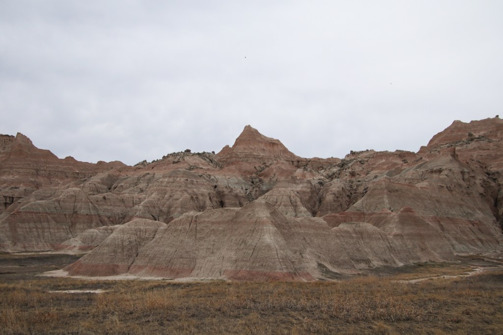 There were far too many photos taken of the amazing Badlands National Park formations, so I had to spend a little time whittling down (and straightening out the ones I shot crookedly – occupational hazard in the back seat on a bumpy road). Such a variety of color, texture, lines and shapes we saw. Fortunately, we didn’t encounter rain or snow in our short tenure there (but there was wind!)