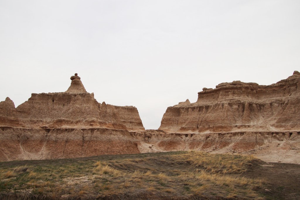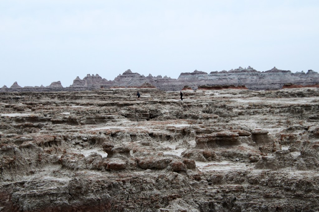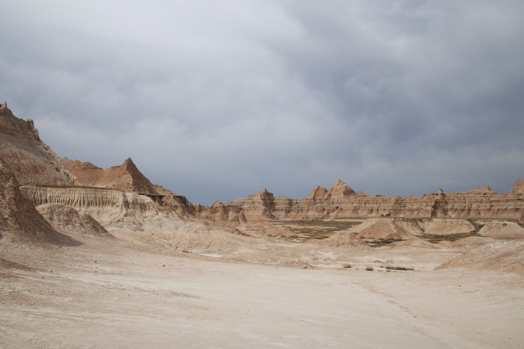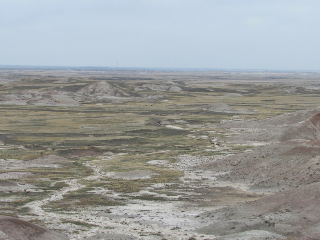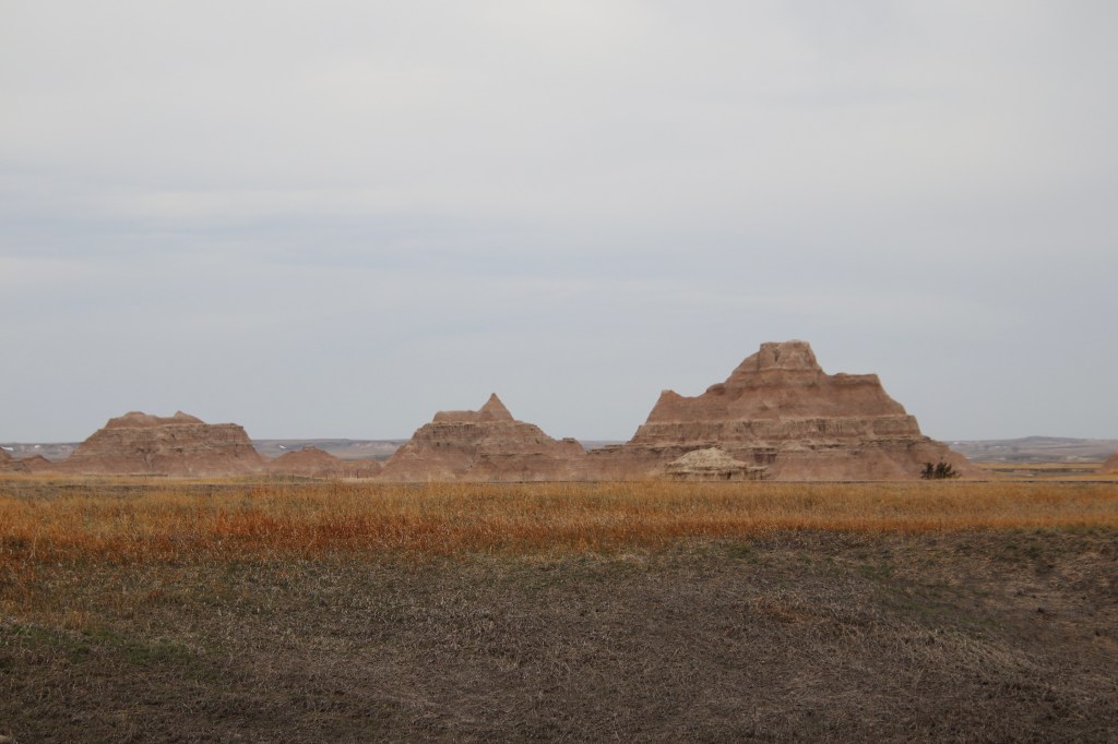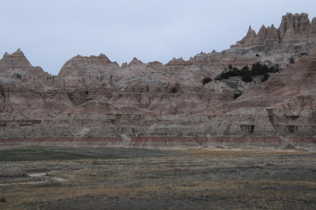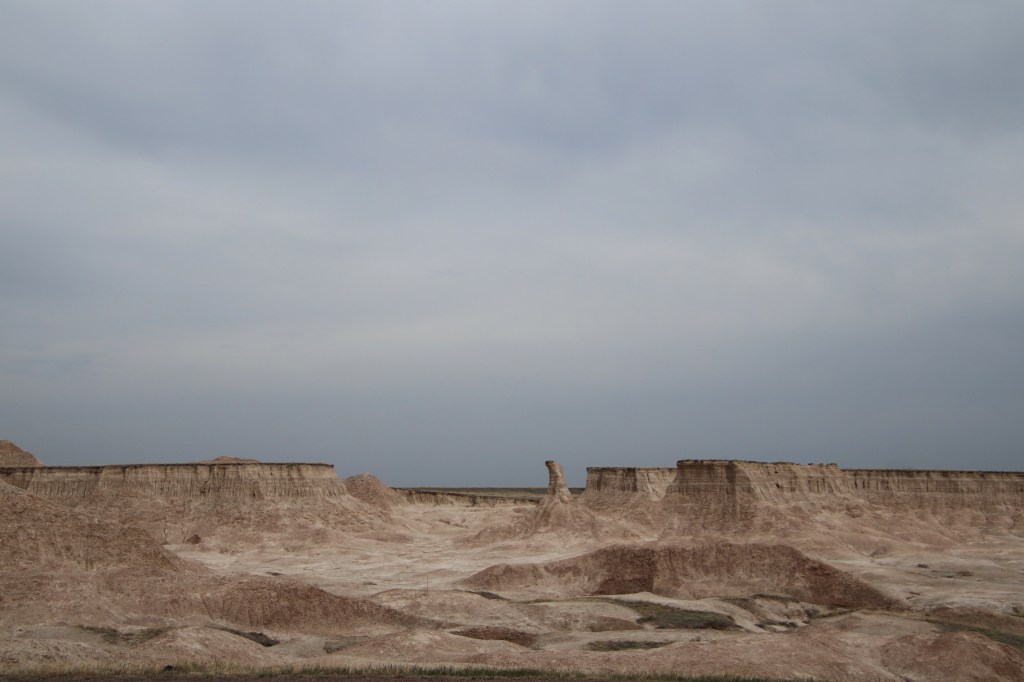 There were far too many photos taken of the amazing Badlands National Park formations, so I had to spend a little time whittling down (and straightening out the ones I shot crookedly – occupational hazard in the back seat on a bumpy road). Such a variety of color, texture, lines and shapes we saw. Fortunately, we didn’t encounter rain or snow in our short tenure there (but there was wind!)