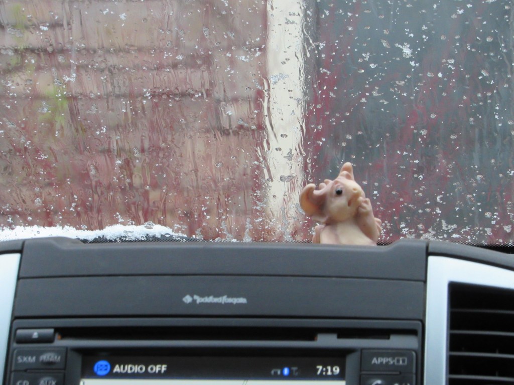 We woke up to snow in Illinois. NatGeo seemed very confused of what that white stuff was on the car. And Koby says the hotel room key works quite well in getting it off the windshield. Good thing we packed layers!