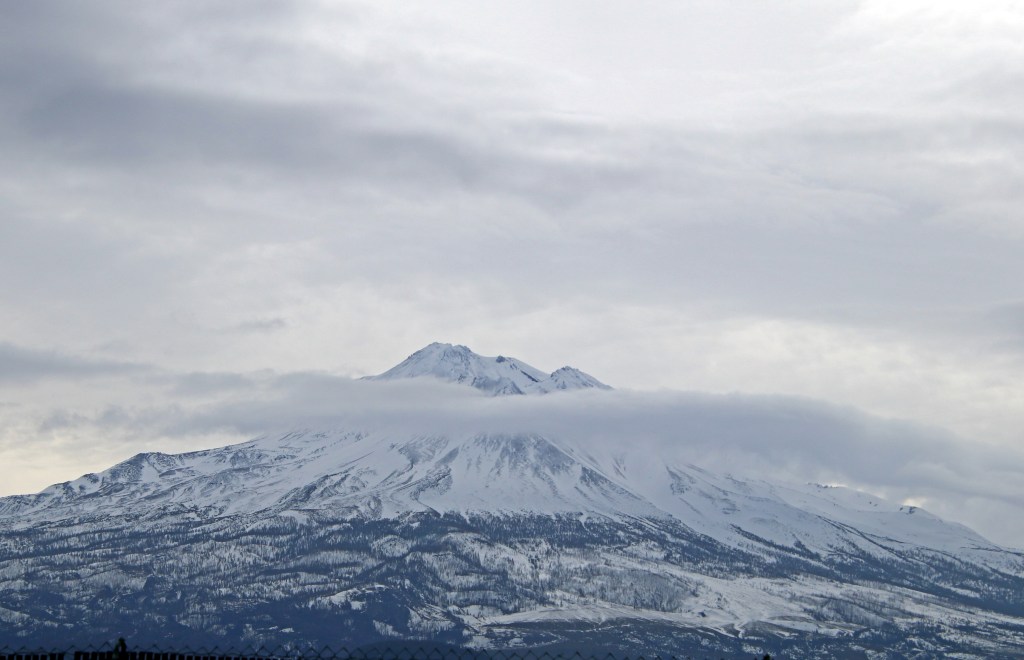 Further up the road, I finally persuaded Koby to stop so I could get a picture of Mount Shasta. Alas, Lassen Peak was covered in those co-existing clouds so nada on photo ops on that one, but here’s Shasta – still cloudy, but not obscured.