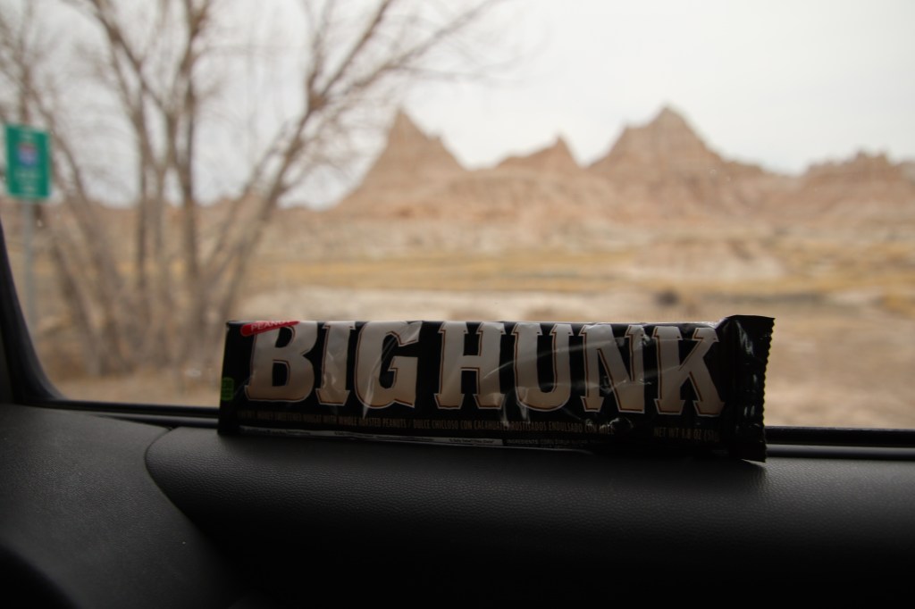 From there we headed to Badlands. I didn’t know much about it, but it was amazing in many ways. But I need to backtrack in my tale. Virtually every store we went into on this trip, Warren looked for a Big Hunk candy bar. It became a quest, and looked like it might become a futile quest – clerks shook their heads, shrugged, and claimed they’d never heard of it. We walked into the Visitors Center at Badlands National Park – and on a shelf almost as soon as we entered, like a homing beacon drawing him to the prize, Warren’s quest concluded. He bought two (just in case they were the only ones available on the trip.)