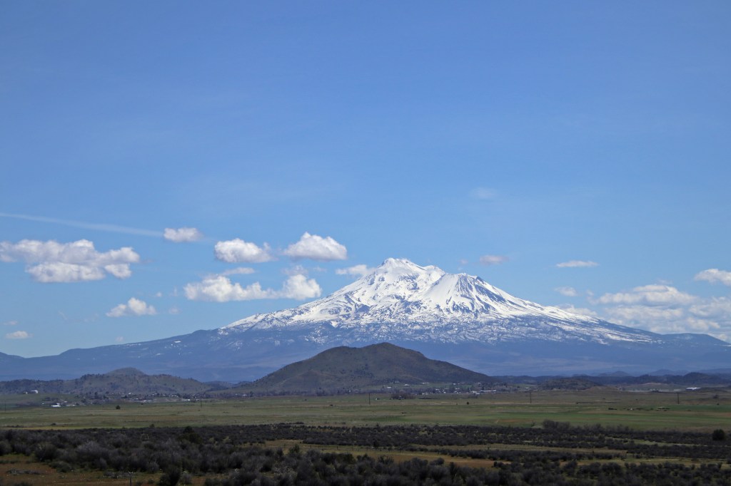 The further south we traveled, the lighter the sky became. Mount Shasta greeted us with blue skies and puffy white clouds.